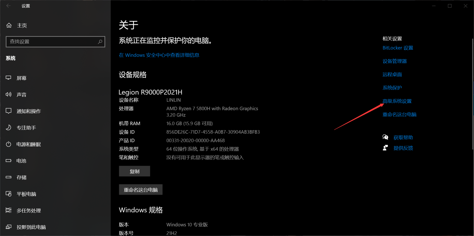回到桌面==>右键此电脑==>点击属性==>进入到关于界面==>点击高级系统设置